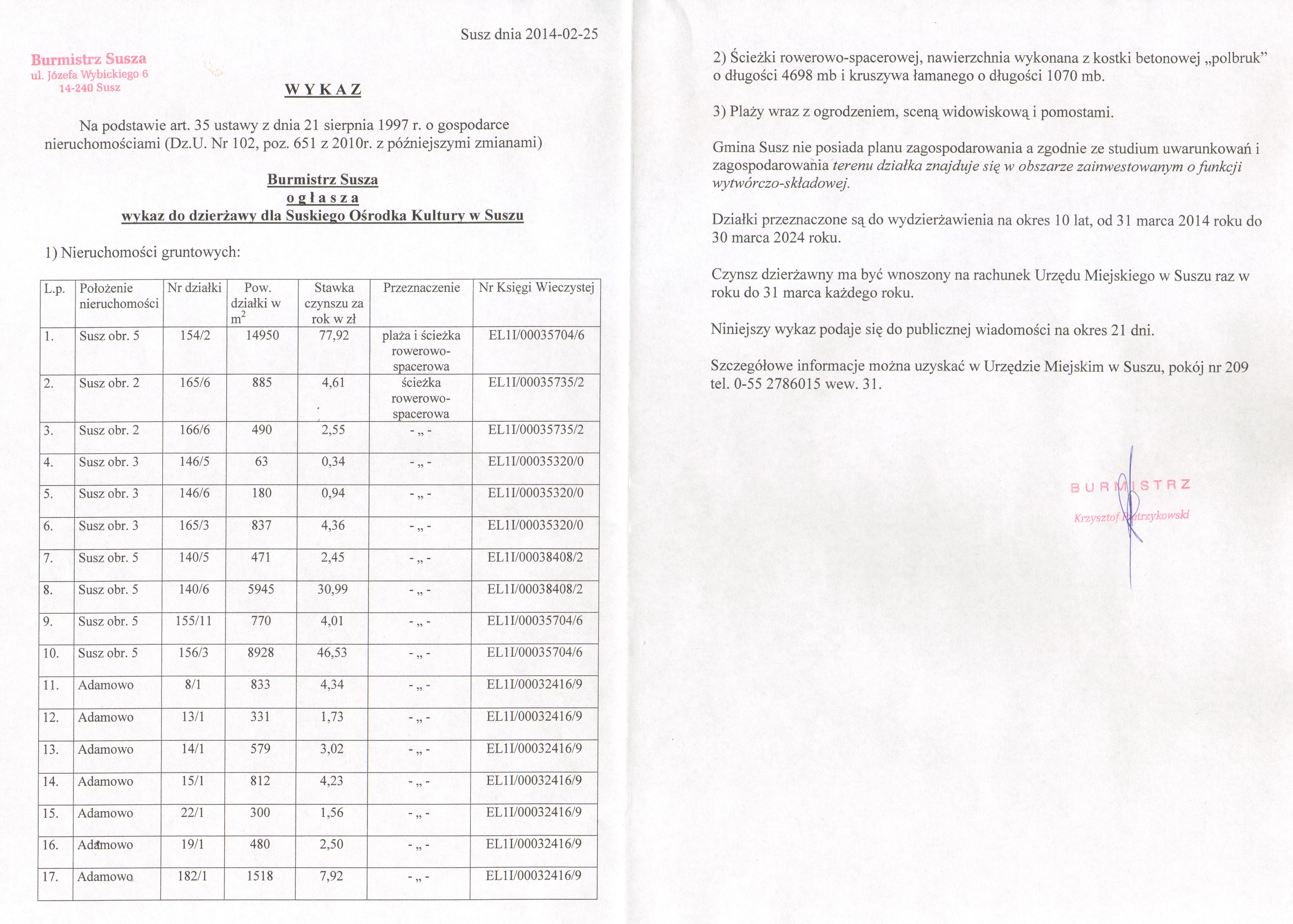 | Skrócony opis: | Wykaz działek gruntu do wydzierżawienia w drodze bezprzetargowej położonych w na terenie gminy i miasta Susz. |