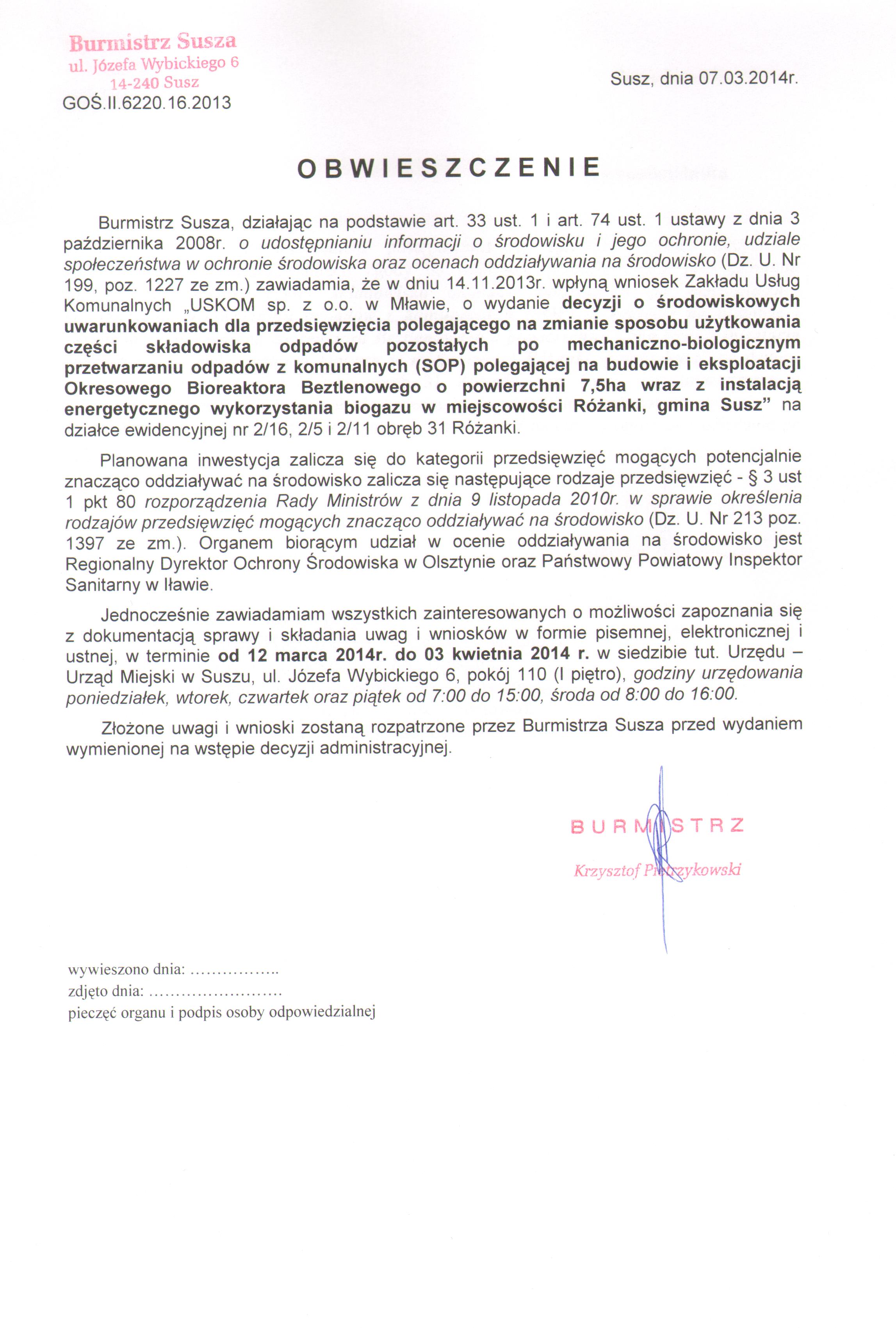 | Skrócony opis: | GOŚ.II.6220.16.2013 - w dniu 14.11.2013 r. wpłynął wniosek Zakładu Usług Komunalnych "USKOM sp. z o.o. w Mławie" dot. wydania decyzji o środowiskowych uwarunkowaniach dla przedsięwzięcia po |