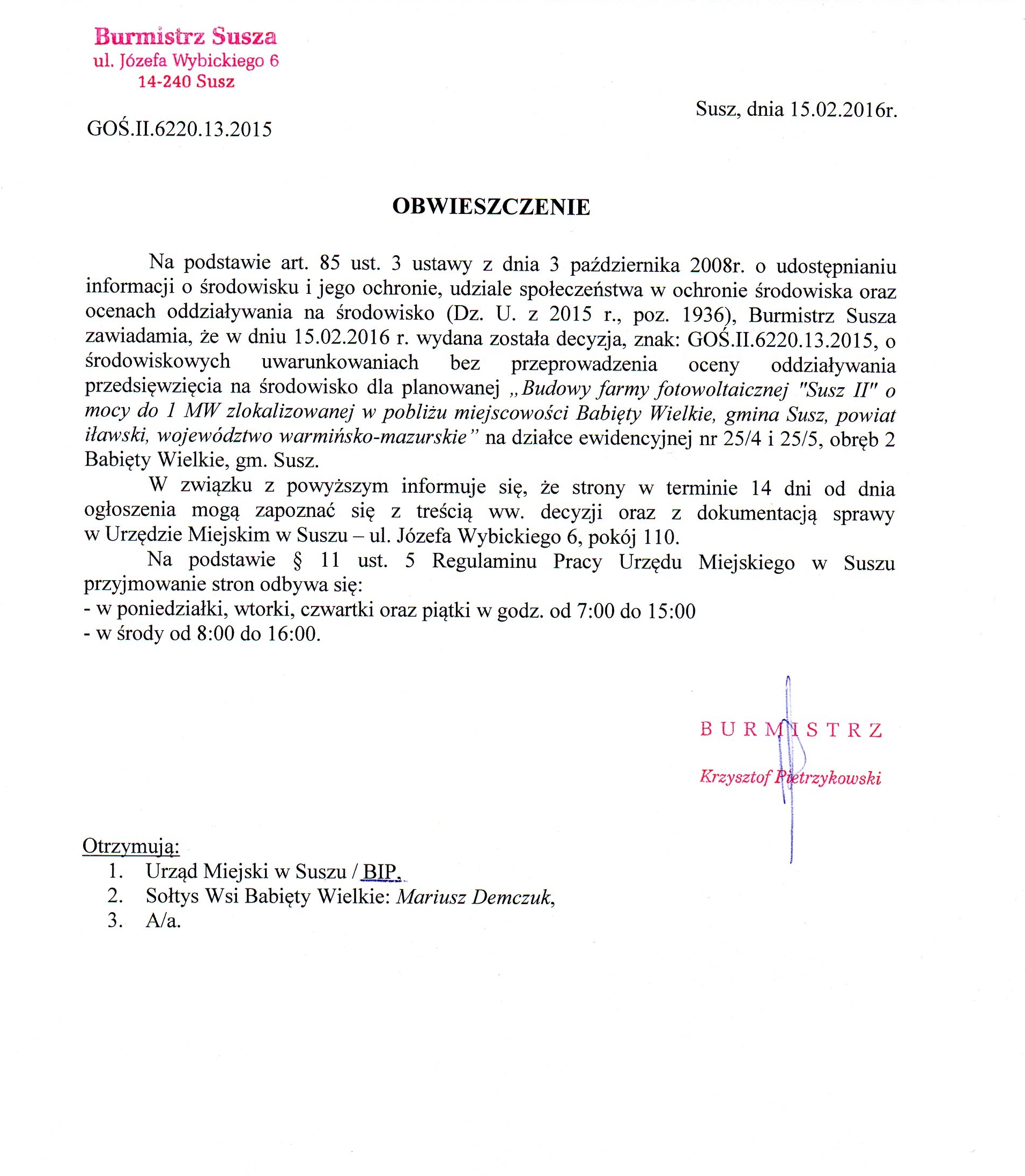 | Skrócony opis: | GOŚ.II.6220.13.2015 - dla przedsięwzięcia polegającego na „Budowy farmy fotowoltaicznej "Susz II" o mocy do 1 MW zlokalizowanej w pobliżu miejscowości Babięty Wielkie” na działce ewidencyj |
