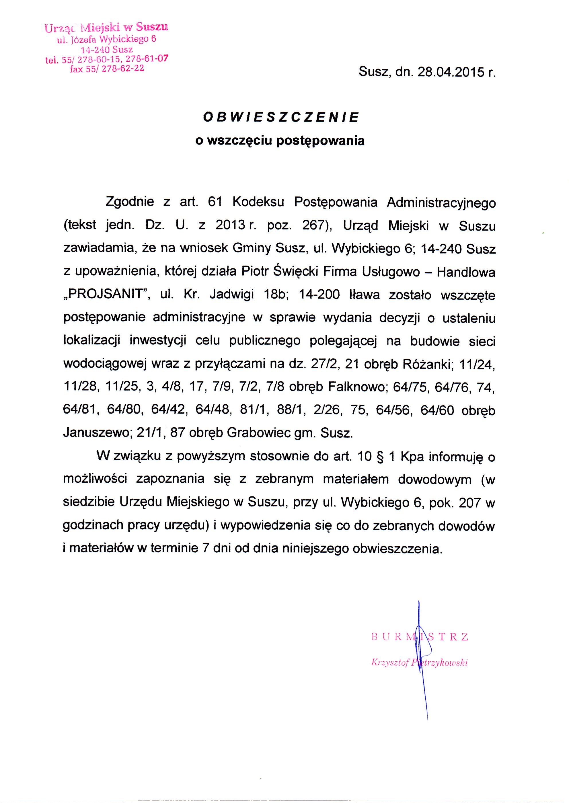 - Obwieszczenie o wszczęciu postępowania administracyjnego w sprawie wydania decyzji o ustaleniu lokalizacji inwestycji celu publicznego polegającej na budowie sieci wodociągowej wraz z przyłączami na dz. 27/2, 21 obręb Różanki; 11/24, 11/28, 11/25, 3, 4/8, 17, 7/9, 7/2, 7/8 obręb Falknowo; 64/75, 64/76, 74, 64/81, 64/80, 64/42, 64/48, 81/1, 88/1, 2/26, 75, 64/56, 64/60 obręb Januszewo; 21/1, 87 obręb Grabowiec gm. Susz.