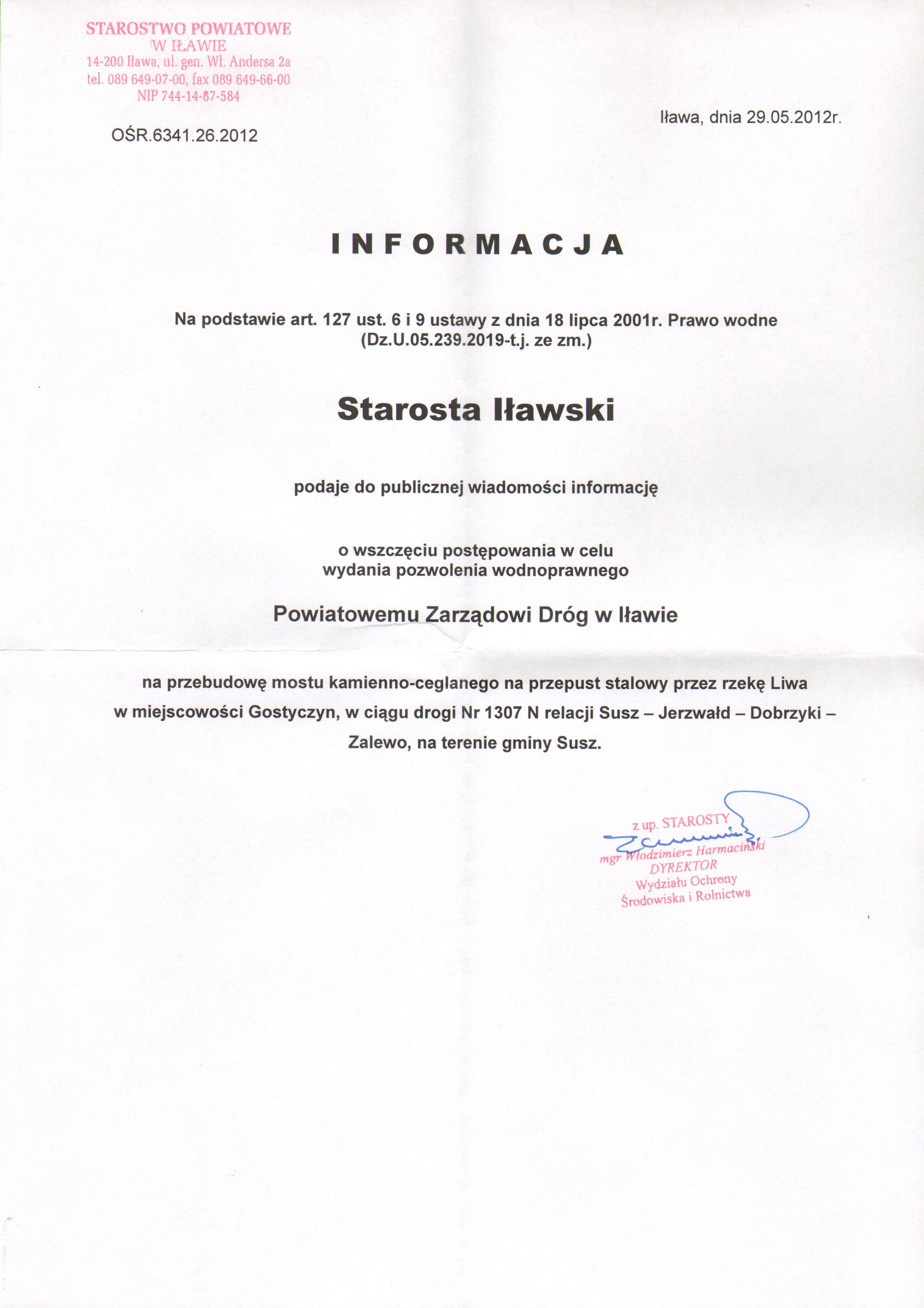 | Skrócony opis: | OŚR.6341.26.2012 Informacje o wszczęciu postępowania w celu wydania pozwolenia wodnoprawnego |