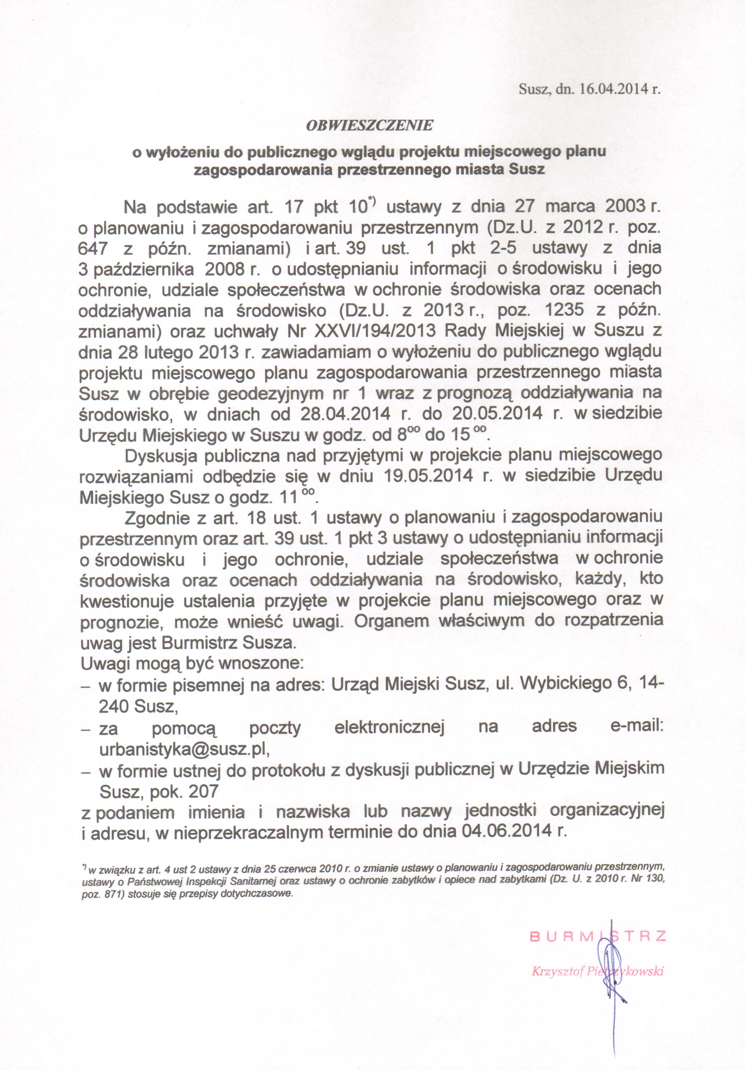| Nazwa dokumentu: | Obwieszczenie o wyłożeniu do publicznego wglądu projektu miejscowego planu zagospodarowania przestrzennego miasta Susz |